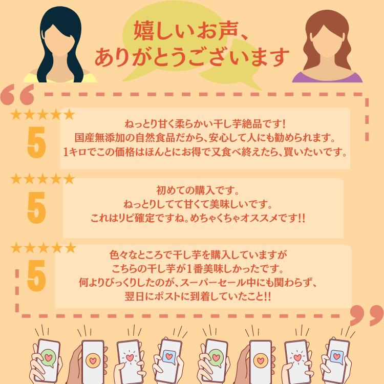 - 「家族みんなでこの干し芋のファンになりました。大容量なので、一緒に楽しむことができています。」(40代男性⭐⭐⭐⭐⭐)